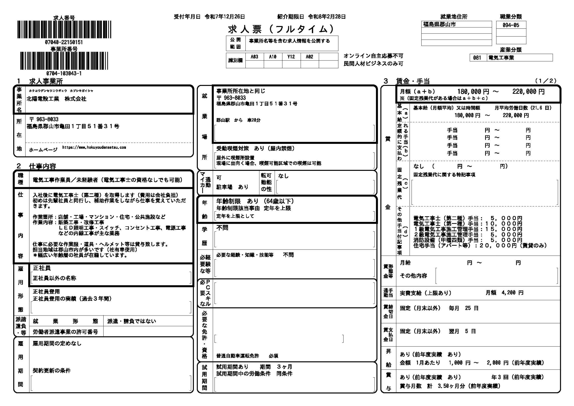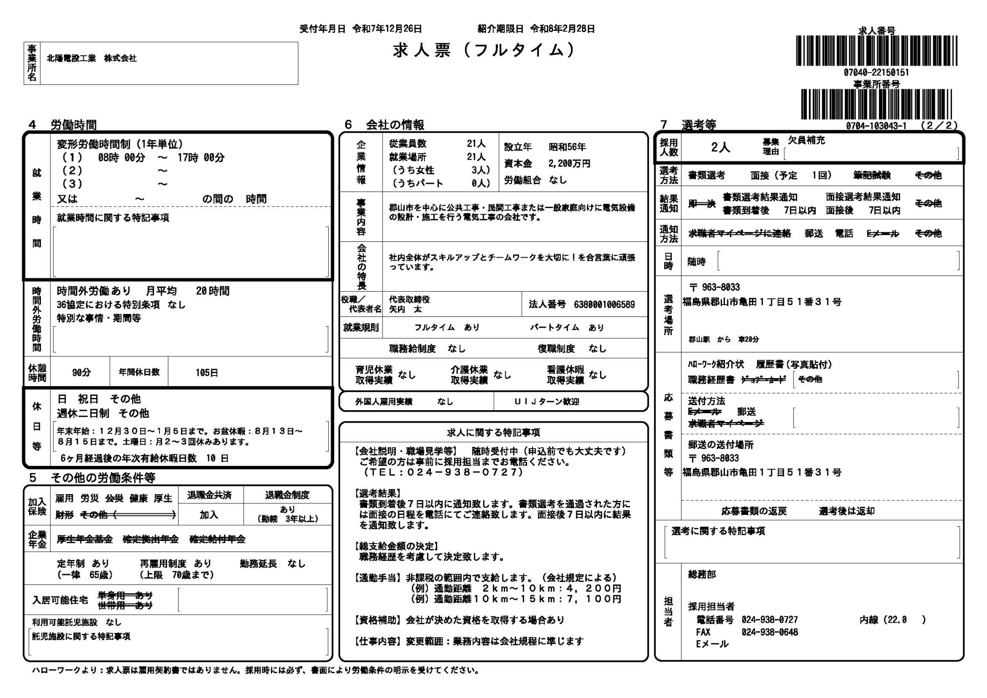 | 勤務地 | 本社 (郡山市亀田) |